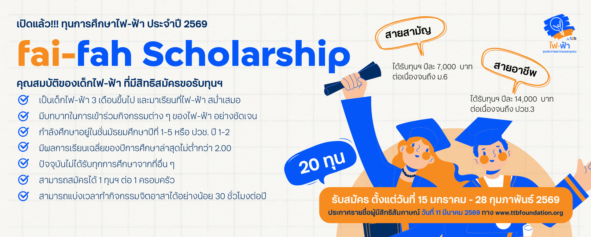 | เปิดรับสมัครออนไลน์ | 15 มกราคม ถึง 28 กุมภาพันธ์ 2569 | ผ่านทางเว็บไซต์ : www.ttbfoundation.org |
